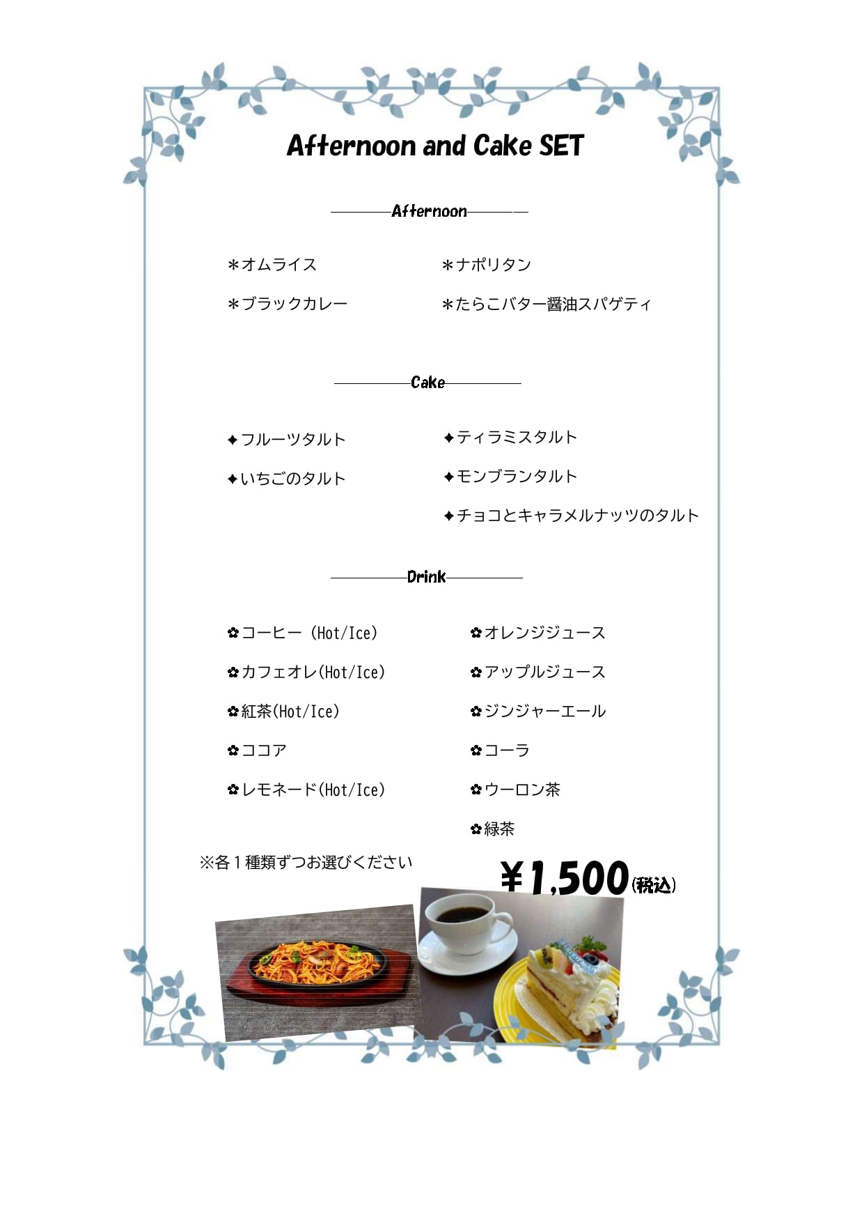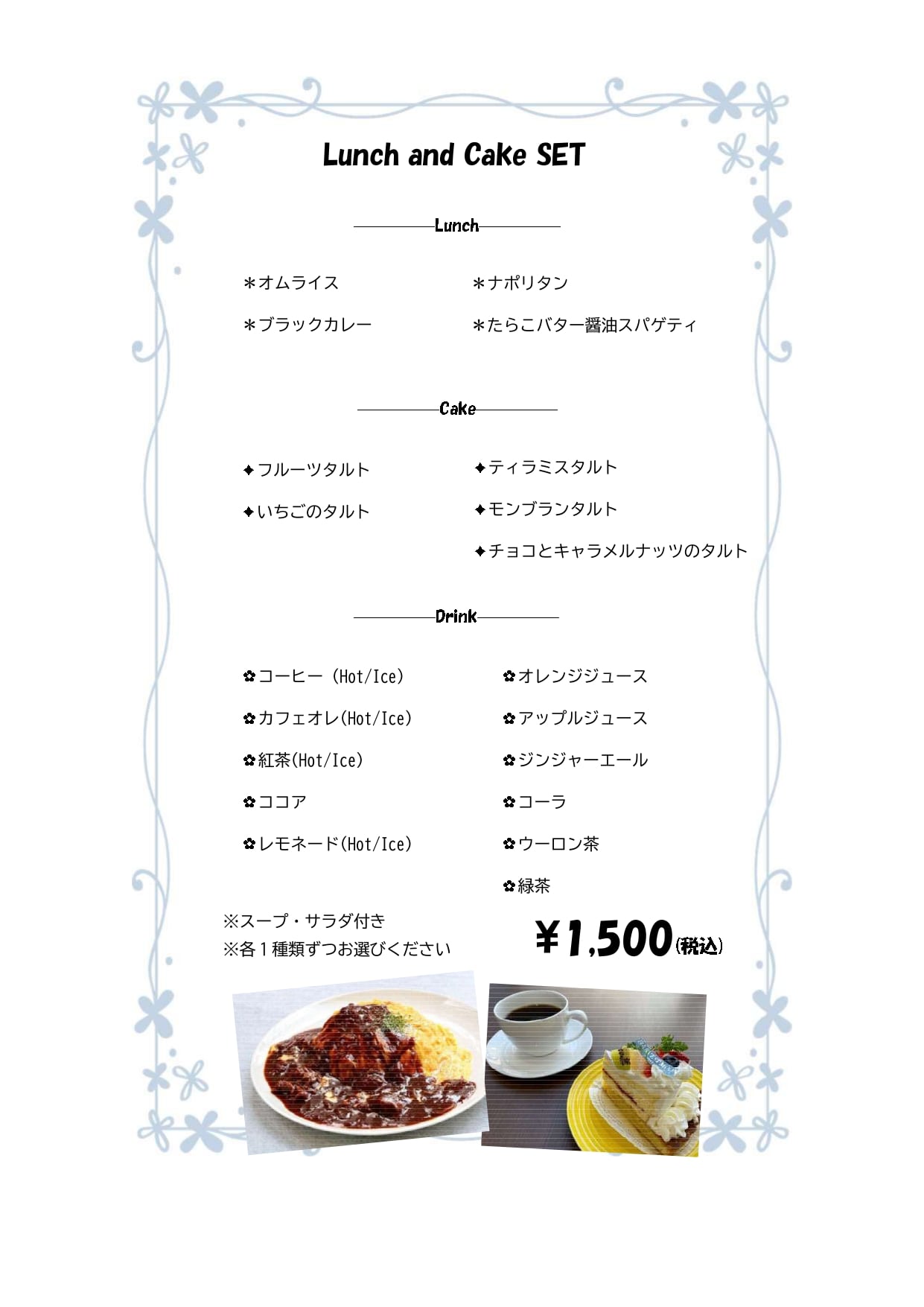 また、お得なケーキセット、ランチ・アフタヌーンセットもご用意しておりますので